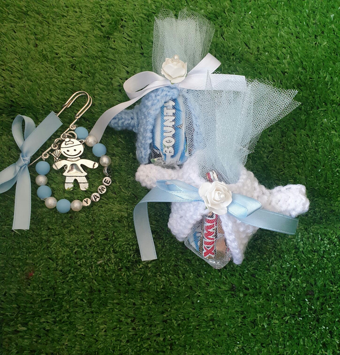 صندوق يحتوي على ٢٥ قطعة من الشوكولا المغلفة بصوف على شكل جاكيت بيبي باللون الازرق للمواليد الذكور واللون الزهري للمولودة الأنثى لتوزيعات حفلة البيبي شاور و وهدية قدوم مولود